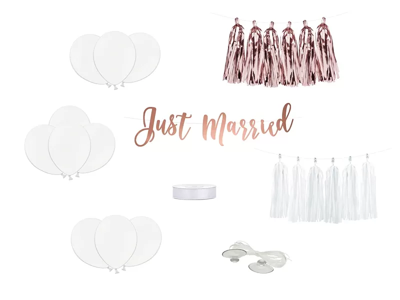 Set obsahuje: rose gold baner s nápisem Just Married (Novomanželé), rose gold střapcovou girlandu "udělej si sám", bílou střapcovou girlandu "udělej si sám", bílé balonky 10ks, bílou saténovou stuhu (délka asi 25 metrů), přísavku na sklo 6ks, nylonová niť cca 12 metrů.