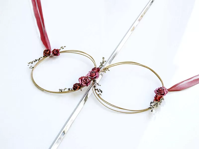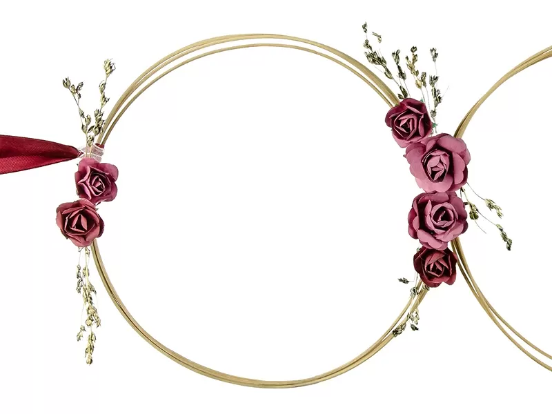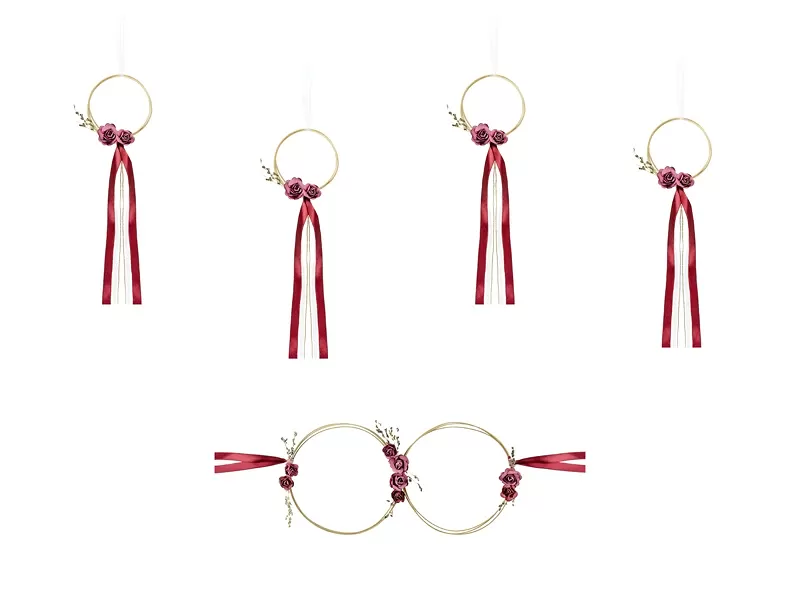 Set obsahuje: 2 spojené kruhy se stuhami (průměr cca 18cm, délka stuh je cca 2.20m) a 4 dekorace pro kliky od dveří (průměr cca 8cm)