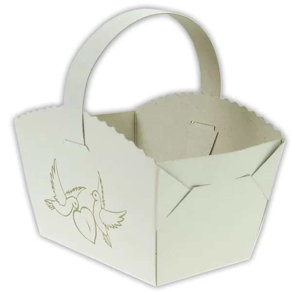 Košíček na svatební výslužku vyrobený u bílého kartonu. Vhodný na koláčky, drobné chuťovky či svatební pečivo.