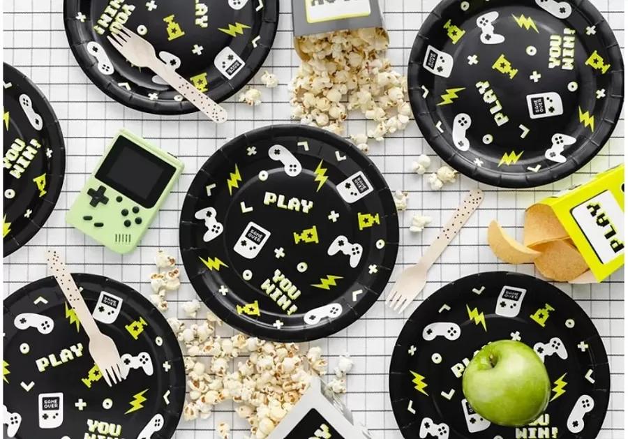 Papírové talíře v barvě černé s motivem Gamer a zelenými neonovými obrázky. Připravte oslavu, nebo party pro správné gamery se vším všudy.