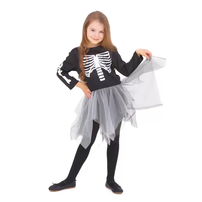 Tyto černé šaty s motivem kostí jsou perfektním kostýmem pro každou malou holčičku na Halloween. Pohodlný střih a snadné oblékání zajistí, že se vaše ratolest bude cítit pohodlně a bude se moci soustředit na zábavu. Tylové šedé dekorace po stranách dodávají objem a luxus. Šaty jsou ideální pro školní karnevaly, halloweenské oslavy nebo tematické večírky. Stačí je doplnit o oranžové punčocháče nebo čelenku. Bližší informace k velikosti lze nalézt v tabulce velikostí viz. obrázek. Balení: 1 ks