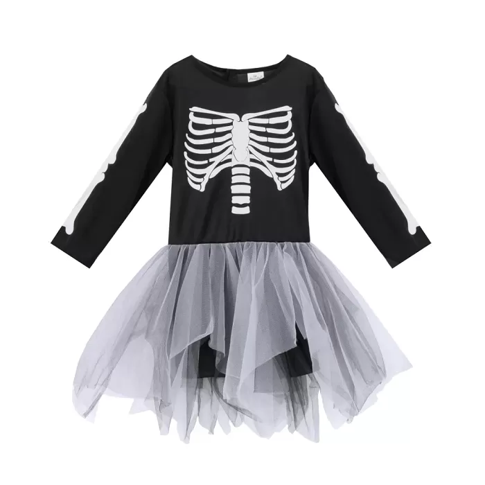 Tyto černé šaty s motivem kostí jsou perfektním kostýmem pro každou malou holčičku na Halloween. Pohodlný střih a snadné oblékání zajistí, že se vaše ratolest bude cítit pohodlně a bude se moci soustředit na zábavu. Tylové šedé dekorace po stranách dodávají objem a luxus. Šaty jsou ideální pro školní karnevaly, halloweenské oslavy nebo tematické večírky. Stačí je doplnit o oranžové punčocháče nebo čelenku. Bližší informace k velikosti lze nalézt v tabulce velikostí viz. obrázek. Balení: 1 ks