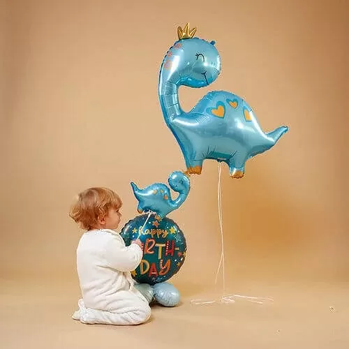 Modrý fóliový balónek ve tvaru dinosaura s korunkou a srdíčky na zádech v motivu Brontosaura. Tento dinosaurus s úsměvem je důkazem, že ne každý velký tvor musí vypadat hrozivě.