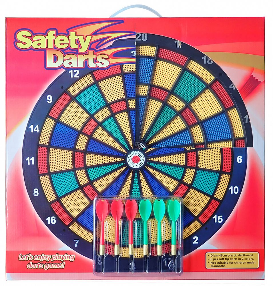 Terč – soft – dírkovaný na šipky s plastovými hroty, průměr 45 cm, + 6 šipek s plastovými bílými hroty. Náhradní hroty v černé barvě jsou součástí balení ( 6 ks ). Terč dodáváme v provedení, viz foto. Doporučeno pro hru, od 7 let věku.