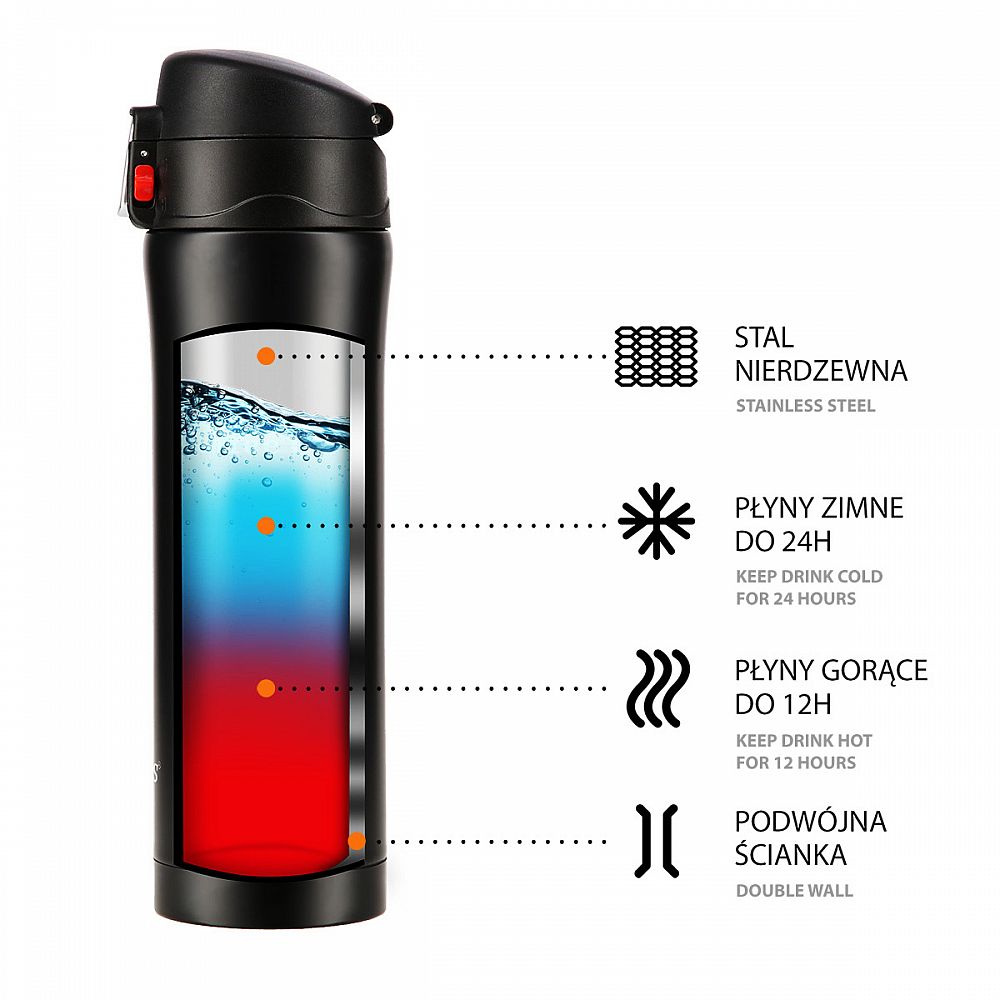 Termoska je vyrobena z nerezové oceli s dvojitou stěnou, která zaručuje uchování teplých nápojů po dobu 12 hodin a studených po dobu 24 hodin, nezáleží tedy, zda si do termosky připravíte ranní kávu, kterou vypijete v kanceláři a nebo zda si do ní přelijete oblíbenou limonádu a vezmete si ji s sebou na několikahodinovou procházku do přírody, termoska udrží Váš nápoj ve správné teplotě.