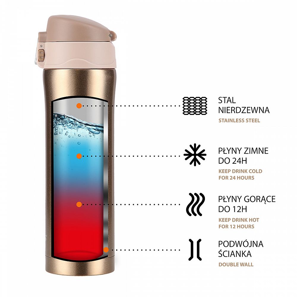 Termoska je vyrobena z nerezové oceli s dvojitou stěnou, která zaručuje uchování teplých nápojů po dobu 12 hodin a studených po dobu 24 hodin, nezáleží tedy, zda si do termosky připravíte ranní kávu, kterou vypijete v kanceláři a nebo zda si do ní přelijete oblíbenou limonádu a vezmete si ji s sebou na několikahodinovou procházku do přírody, termoska udrží Váš nápoj ve správné teplotě.