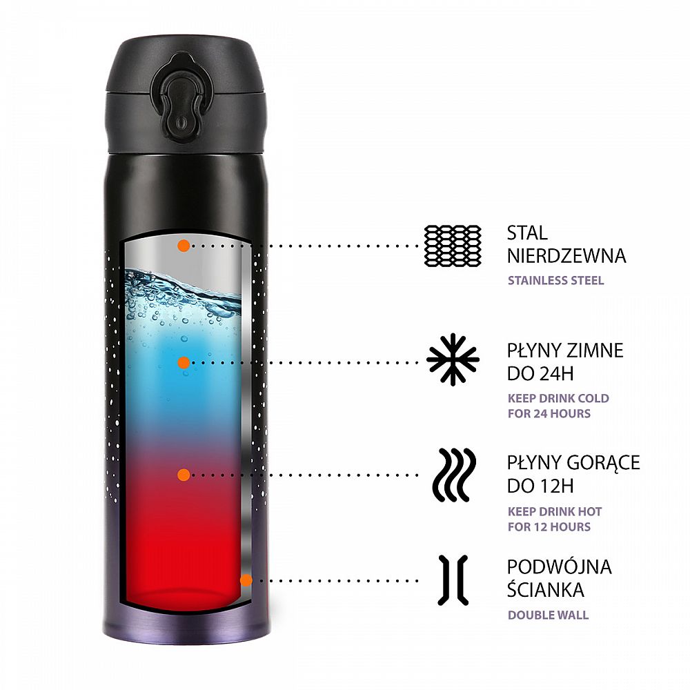 Termoska je vyrobena z nerezové oceli s dvojitou stěnou, která zaručuje uchování teplých nápojů po dobu 12 hodin a studených po dobu 24 hodin, nezáleží tedy, zda si do termosky připravíte ranní kávu, kterou vypijete v kanceláři a nebo zda si do ní přelijete oblíbenou limonádu a vezmete si ji s sebou na několikahodinovou procházku do přírody, termoska udrží Váš nápoj ve správné teplotě.