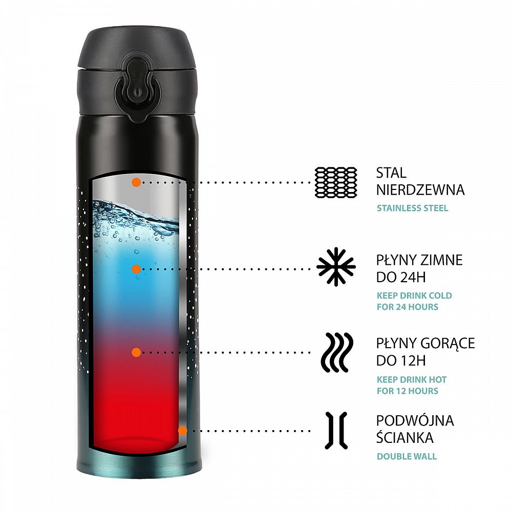 Termoska je vyrobena z nerezové oceli s dvojitou stěnou, která zaručuje uchování teplých nápojů po dobu 12 hodin a studených po dobu 24 hodin, nezáleží tedy, zda si do termosky připravíte ranní kávu, kterou vypijete v kanceláři a nebo zda si do ní přelijete oblíbenou limonádu a vezmete si ji s sebou na několikahodinovou procházku do přírody, termoska udrží Váš nápoj ve správné teplotě.