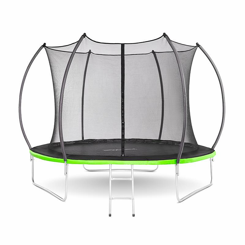 - Ochranná síť uvnitř rámu: Umístění sítě uvnitř konstrukce zabraňuje kontaktu s pružinami, čímž snižuje riziko zranění při skákání.