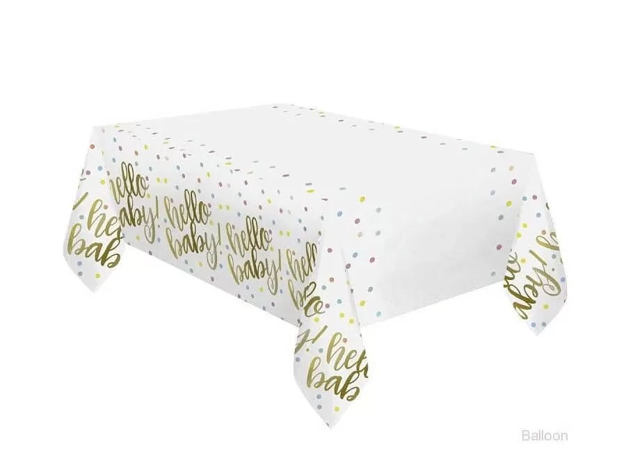 Plastový ubrus v bílé barvě s barevnými puntíky a zlatým nápisem Hello Baby bude krásnou a praktickou dekorací na oslavě při přivítání nového člena na svět, nebo třeba baby shower, dokud nevíte, jestli máte holčičku, či chlapečka.