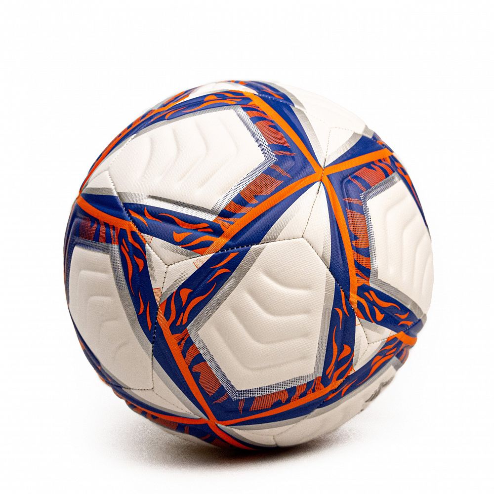 Moderní Design: Míč vyniká svěžím bílým designem doplněným o dynamické modré a oranžové grafické prvky, které mu dodávají moderní a sportovní vzhled.