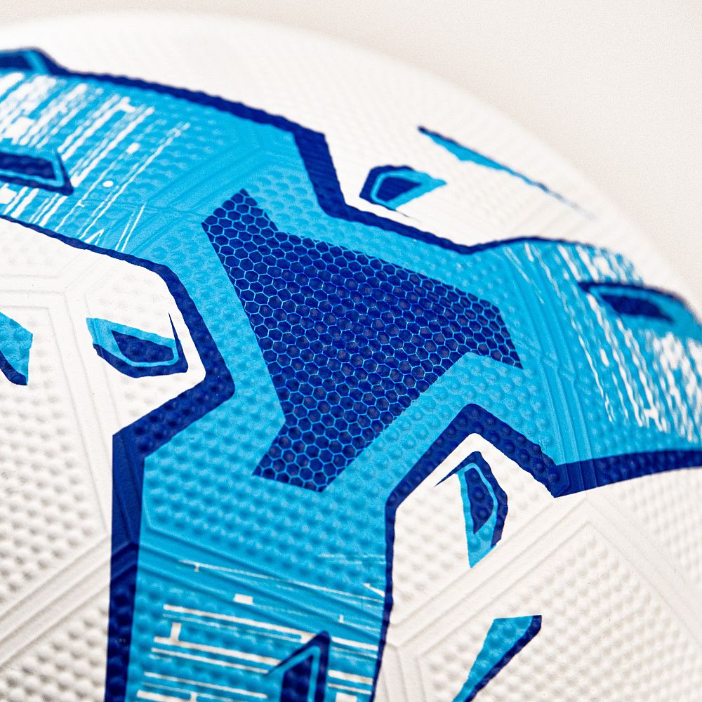 Moderní Modro-Bílý Design: Míč se vyznačuje svěžím bílým základem a výraznými modrými grafickými prvky ve futuristickém geometrickém stylu. Tento design nejenže vypadá skvěle, ale také pomáhá s vizuální sledovatelností míče během hry.