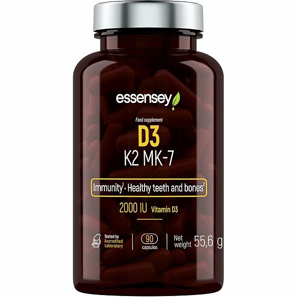 ESSENSEY D3 K2 MK-7. Doplněk stravy. Přípravek v kapslích obsahuje 2000 IU vitaminu D3 a vitamin K2 MK-7. Vitamin D přispívá k normální funkci imunitního systému. Vitamin D přispívá k udržení normálního stavu kostí a zubů.
