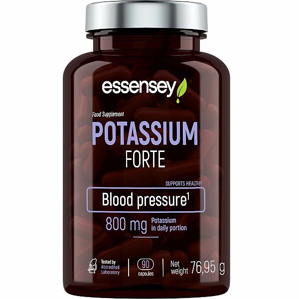 ESSENSEY POTASSIUM FORTE. Doplněk stravy. Výrobek v kapslích s obsahem 800 mg draslíku v denní dávce výrobku. Draslík přispívá k udržení normálního krevního tlaku.