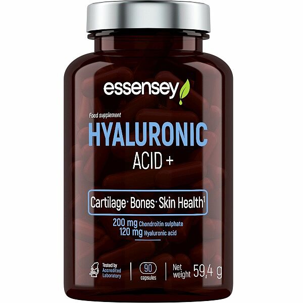 ESSENSEY HYALURONIC ACID +. Doplněk stravy. Přípravek v kapslích s obsahem chondroitin sulfátu, kyseliny hyaluronové, L-prolinu a vitaminu C. Vitamin C přispívá k normální tvorbě kolagenu pro normální funkci chrupavek, kostí a kůže.