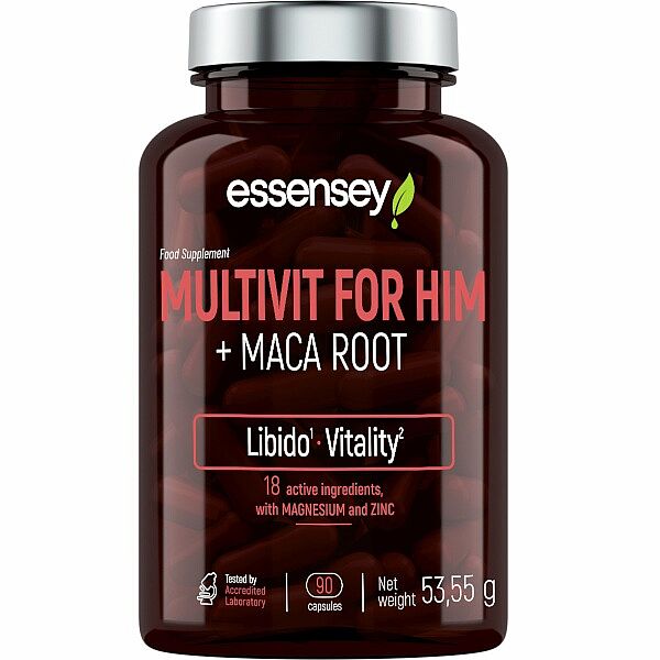 ESSENSEY MULTIVITAMIN PRO MUŽE + KOŘEN MACA. Doplněk stravy. Přípravek v kapslích s obsahem vitaminů, L-argininu, extraktu z kořene maca, DAA, taurinu, hořčíku a zinku. Maca přispívá k udržení přirozené sexuální aktivity a energie. Stimuluje sexuální apetit. Maca pomáhá udržovat optimální výdrž a vitalitu. Vitamin B6 a B12, zinek a vitamin C přispívají k normální funkci imunitního systému. Riboflavin, vitamin B6 a hořčík přispívají ke snížení únavy a vyčerpání.
