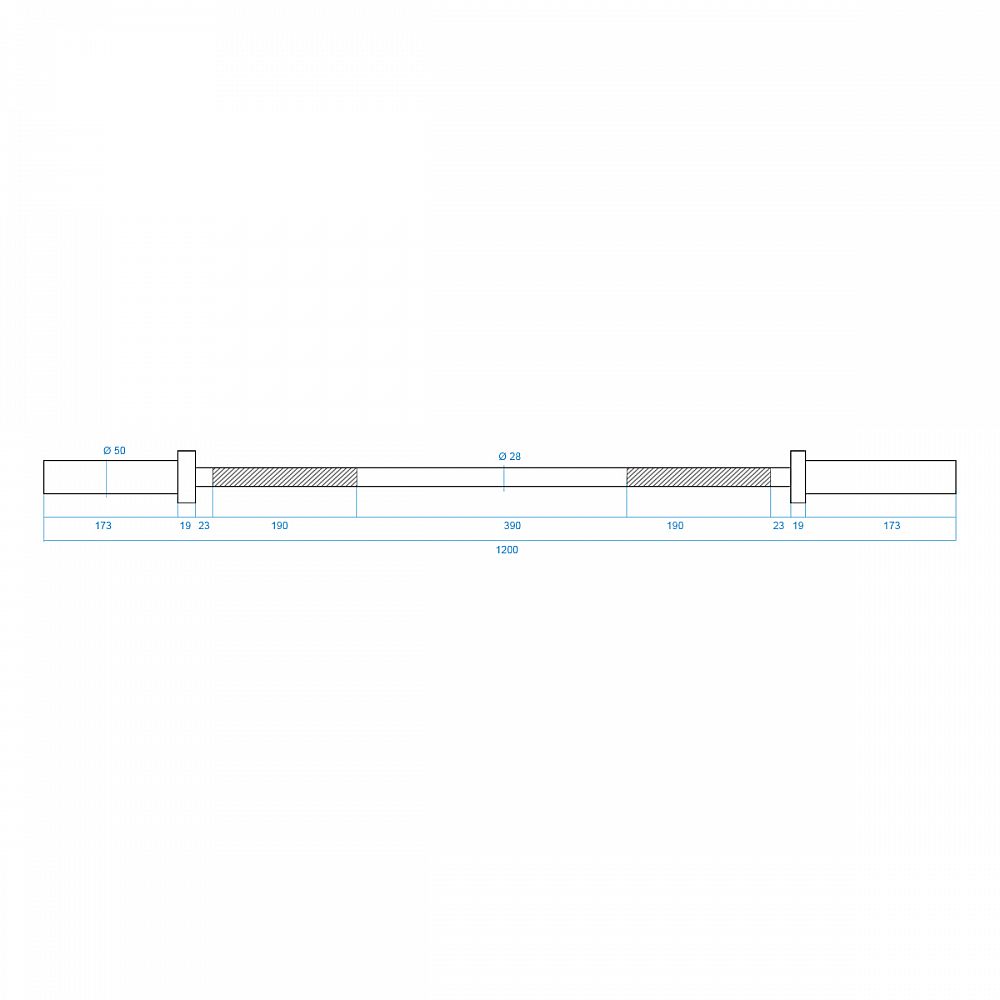 Průměr úchopové části je 28 mm a zajišťuje vysokou odolnost a pohodlí během tréninku. Použitý proces chromování hřídele je zárukou zachování jejího vzhledu po dlouhou dobu jejího používání a také je nejlepší ochranou proti korozi.