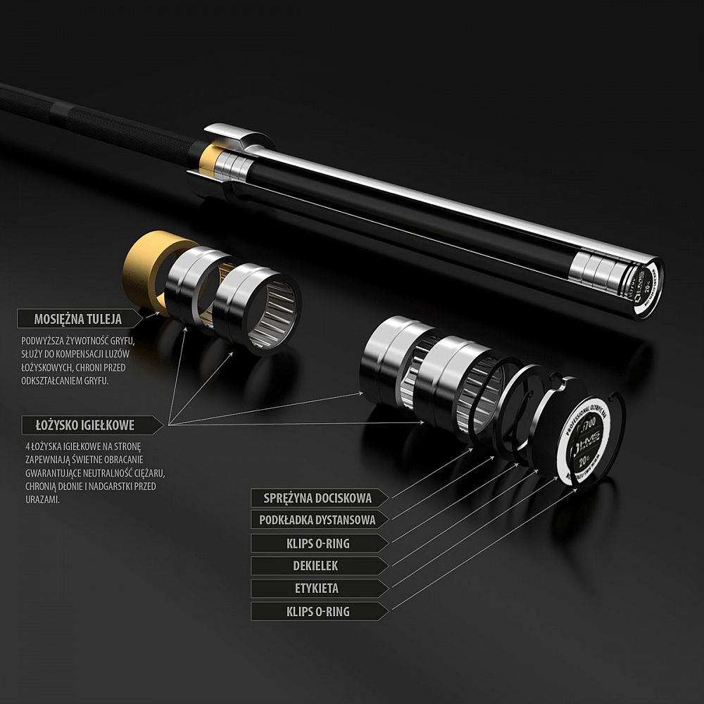 Olympijská hřídel GCF700 HMS PREMIUM má 8 jehličkových ložisek (4 na každé straně), které umožňují hladké a plynulé otáčení rukávů na hřídeli. Její konstrukce snižuje napětí na koncích válečků, což má za následek vyšší životnost ložisek. Navzdory svého malého průřezu mají jehličková ložiska vysokou tuhost a nosnost.